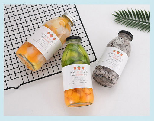 Wysokiej jakości materiał szklany, pogrubione usta butelki, gwint na dnie butelki antypoślizgowy, dobre uszczelnienie, odwrócony wyciek wody.300 ml 350 ml 500 ml wybór wielu pojemności, stosowany do wszystkich rodzajów opakowań napojów z sokami owocowymi